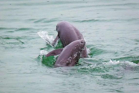 5月10日,在湖北省宜昌市長(zhǎng)江邊,江豚在水中嬉戲